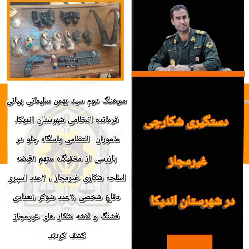 سرهنگ دوم “سید بهمن سلیمانی پیانی” بیان داشت: ماموران انتظامی پاسگاه چلو از اقدام غیرقانونی یک شکارچی غیر مجاز که اقدام به شکار پرندگان می کرد، مطلع شدند.وی افزود: ماموران با اشراف اطلاعاتی و پلیسی فرد مورد نظر را شناسایی و طی عملیاتی ضربتی دستگیر کردند.فرمانده انتظامی اندیکا گفت: ماموران در بازرسی از مخفیگاه متهم *`