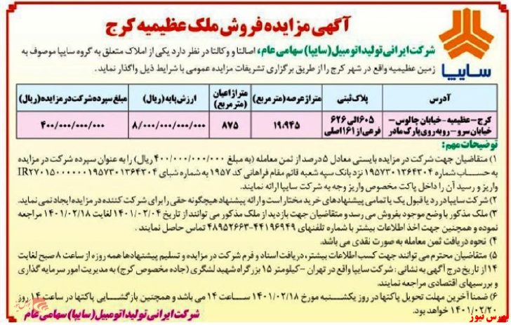 براساس آگهی مزایدهای که از سوی شرکت سایپا منتشر شده، این گروه زمینی به مساحت نزدیک به ۲۰ هزار مترمربع را در عظیمیه شهر کرج به مزایده گذاشته است. قیمت پایه این زمین ۸۰۰ میلیارد تومان برآورد شده است.